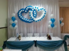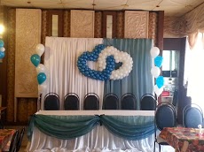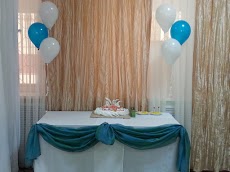 Оформление воздушными шарами и тканью подчеркивает значимость долгожданного торжества.