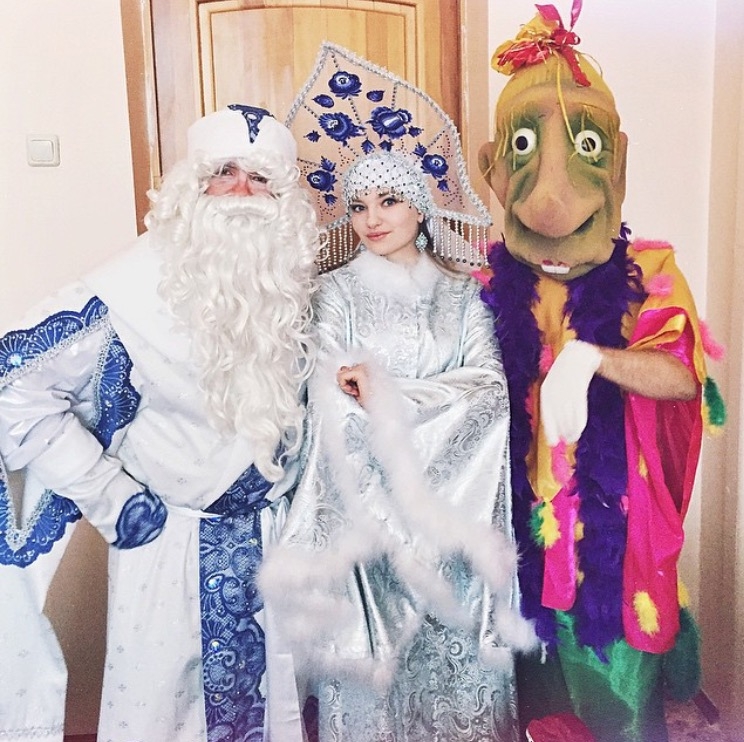 Состав: Дед Мороз. Снегурочка. Медведь (аниматор). Кикимора. Фокусник. Собака-трансформер (мгновенные переодевания). Снежная Королева. Метель. Дрессированная обезьяна. Шар-сюрприз.