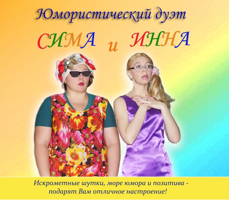 Описание: Творческий дуэт зажигательных дам, наполняет атмосферу любого праздника смехом и весельем. Яркие образы Симы и Инны сразу же привлекают внимание гостей, а авторские миниатюры о событиях повседневной жизни - доставляют много смеха и удовольствия всем гостям без исключения.